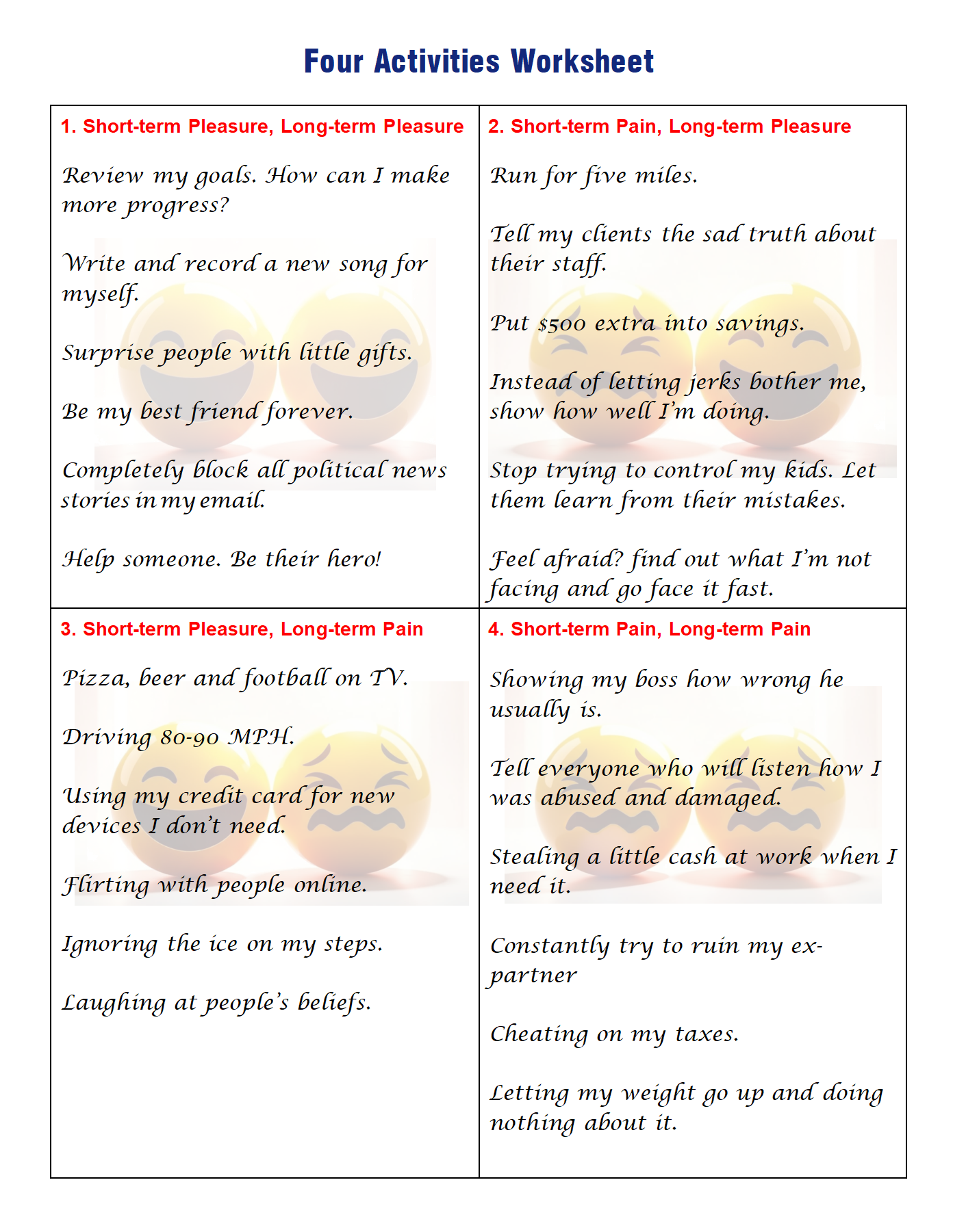 So Roger does the exercise and adds a dozen pleasurable life activities to his list. Then he replaces this harmful pleasure with better ones.