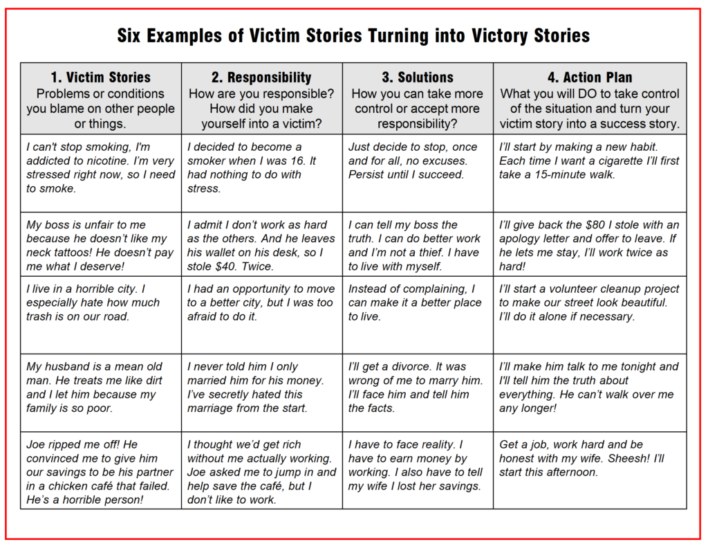 - You might use your victim story to get out of doing hard work, facing tough situations or being responsible. You cannot succeed without these three skills.